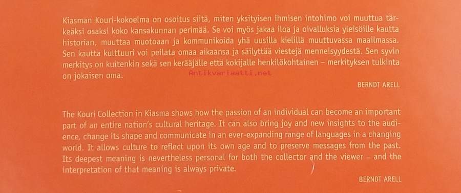 Kouri-kokoelma Nykytaiteenmuseo Kiasmassa tarjoaa ainutlaatuisen näkymän siihen, miten yhden ihmisen intohimoinen keräily voi kasvaa merkittäväksi osaksi kansallista kulttuuriperintöä ja tuoda iloa sekä uusia oivalluksia yhä uusille sukupolville. Kuvitettu. Dimensiot 27 ¤ 23 cm.