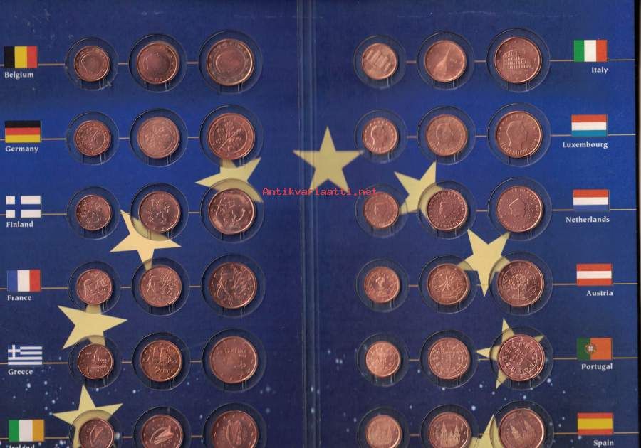 Euro yhteisvaluutta maiden: Belgia, Saksa, Suomi, Ranska, Kreikka, Irlanti, Italia, Luxemburg, Alankomaat, Itävalta, Portugali, Espanja 1,2 ja 5 sentin kolikot 1999-2002.-Suuri Helposti kuori