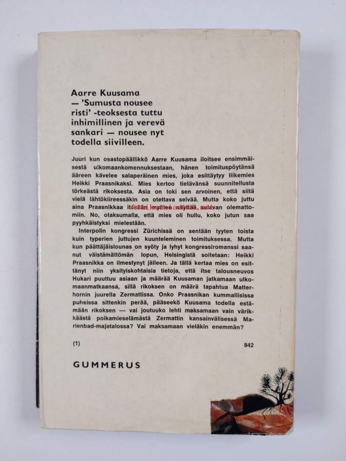 Hyvä. Pienoista kulumaa reunoilla ja kulmissa, selkämyksessä lukutaittumaa, selkämyksessä vinoutta. Kansipaperin kunto: joitain repeämiä/kulumaa