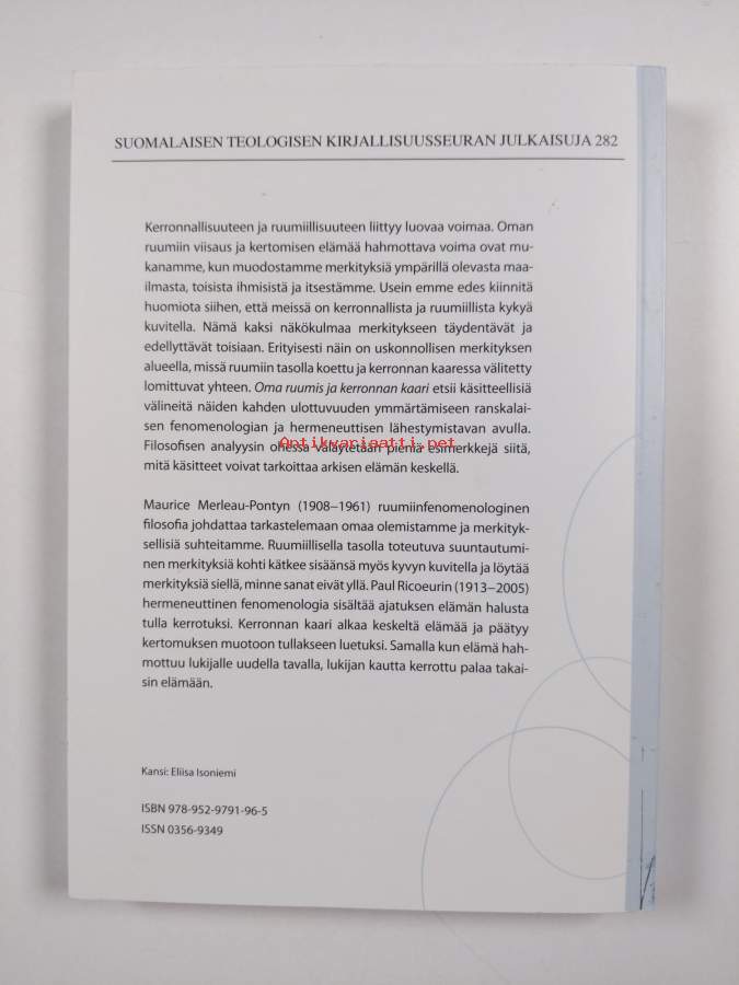 Koko nimi: Oma ruumis ja kerronnan kaari : merkityksen muodostuminen Maurice Merleau-Pontyn ruumiinfenomenologisen ja Paul Ricoeurin narratiivisen imaginaatiokäsityksen mukaan - Merkityksen muodostuminen Maurice Merleau-Pontyn ruumiinfenomenologisen ja Paul RicoeuriSarja: Suomalaisen teologisen kirjallisuusseuran julkaisuja 282Asiasanat: ruumiinkuva, identiteetti, fenomenologia, ruumis, ruumiillisuus, hermeneutiikka, narratiivisuus, merkitys
