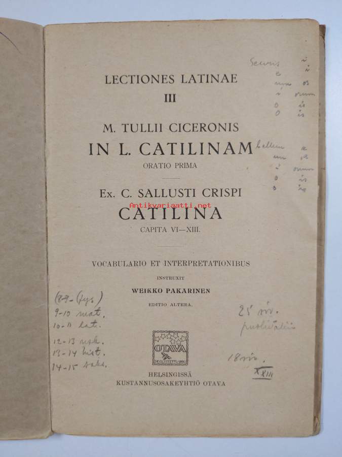 Koko nimi: M. Tullii Ciceronis in L. Catilinam oratio prima : ex C. Sallusti Crispi Catilina capita VI-XIII : vocabulario et interpretationibus = Ciceron I puhe Catilinaa vastaan ynnä jakso Sallustiuksen "Catilinan sotaa" : sanasto ja selityksiäMuu(t) tekijä(t): Marcus Tullius Cicero, Caius Sallustius CrispusSarja: Lectiones latinae 3