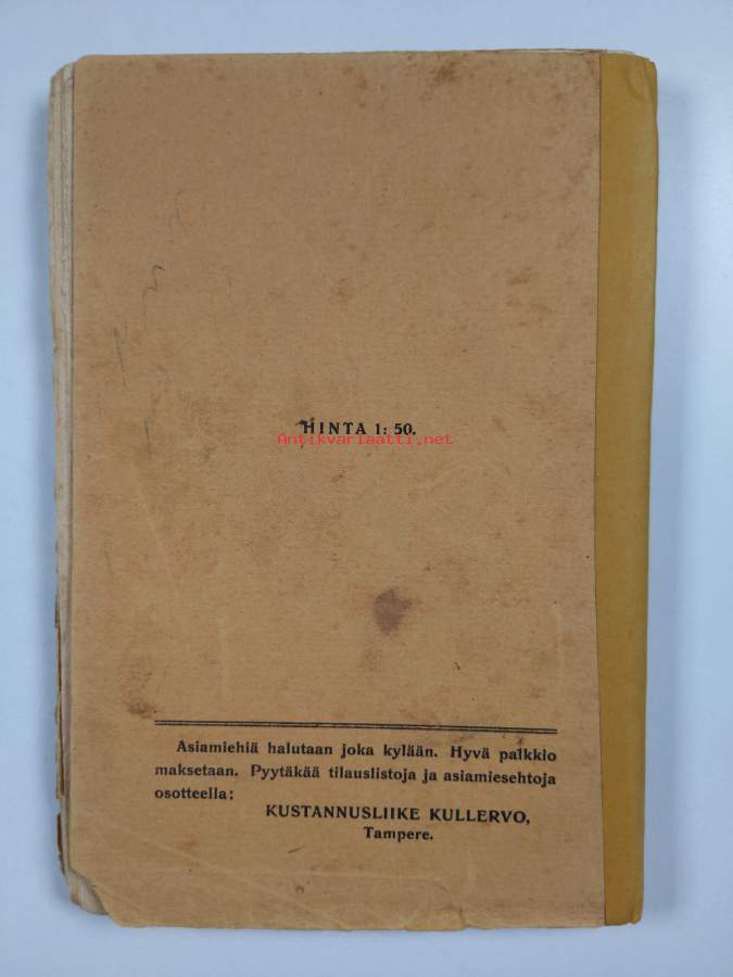 Tyydyttävä. Tarkempi kuntoluokka: K2- ; Hieman repeämää reunoilla ja kulmissa, hieman tahraisuutta etukannessa, selkämyksessä hieman vinoutta. selkämystä teipattu ; selkämykseen kirjoitettu kirjan nimi mustekynällä