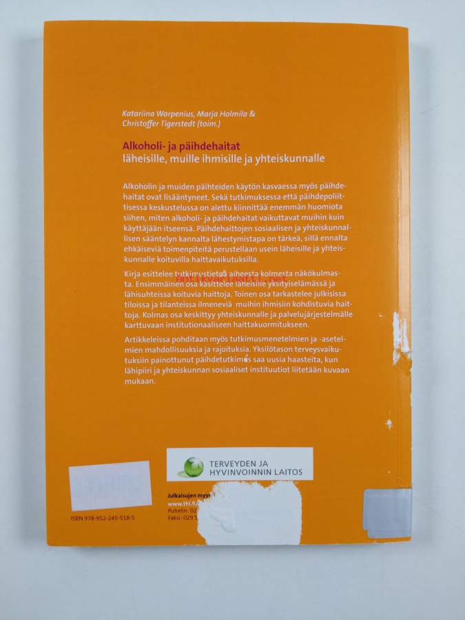Muu(t) tekijä(t): Christoffer Tigerstedt, Marja Holmila ym.Sarja: Teema / Terveyden ja hyvinvoinnin laitos 14Asiasanat: kustannukset, haitat, ihmissuhteet, nuoret, sosiaaliset ongelmat, alkoholismi, alkoholi, lastensuojelu, läheiset, vanhemmuus, perhe, vanhukset, päihteet, sosiaalityö, rikokset, liikenneonnettomuudet, alkoholistit, päihdeongelmaiset, alkoholinkäyttö, yhteiskunta, sosiaaliset suhteet, perheväkivalta, terveyspalvelut, päihdeongelmat, huumeet, huumeongelmat, väkivaltarikokset, yhteiskunnalliset vaikutukset, alkoholiongelmat, sosiaalipalvelut, perhesuhteet, työkyvyttömyys, järjestyshäiriöt, päihderiippuvuus, palvelujärjestelmät, ehkäisevä päihdetyö, sairauspoissaolot, parisuhdeväkivalta, substance-related disorders, liikennejuopumus, Alcoholism, Family Relations, Adolescent, Child, Aged, alcohol drinking, Social Behavior Disorders, Interpersonal Relations, Family, Domestic Violence, social work, crime, Community Health Services, Accidents, Traffic, Substance Abuse Treatment Centers