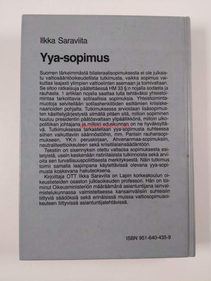 Koko nimi: YYA-sopimus : tutkimus Suomen ja Sosialististen Neuvostotasavaltain Liiton välillä ystävyydestä, yhteistoiminnasta ja keskinäisestä avunannosta 6.4.1948 allekirjoitetusta sopimuksesta Suomen oikeusjärjestyksessäMerkinnät: omistajamerkintä (leima)Sarja: Lapin korkeakoulun oikeustieteiden osaston julkaisuja Sarja A n:o 2Asiasanat: kansainväliset sopimukset, YYA-sopimus, kansainvälinen oikeus, valtiosääntöoikeus