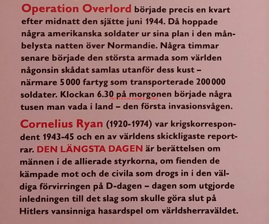 Sotahistoriikki perustuu satoihin haastatteluihin liittoutuneiden, saksalaisten ja ranskalaisten sotilaiden sekä siviilien kanssa - erittäin vaikutusvaltainen kuvaus D-Daysta. Dimensiot 23 ¤ 16 cm.