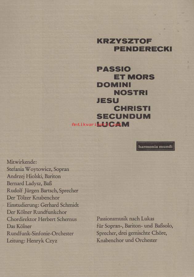 Baritone Vocals – Andrzej HiolskiBass Vocals – Bernard LadyszChoir – Die Kölner RundfunkchorComposed By – Krzysztof PendereckiKahden LP-levyn kangaspäällysteinen kansio + 15 s. vihko: puola/saksa/englanti. Kansion vaantomuovipehmusteet rispaantuneet. Levyt erittäin siistit ja hyväkuntoiset.-Postipaketti
