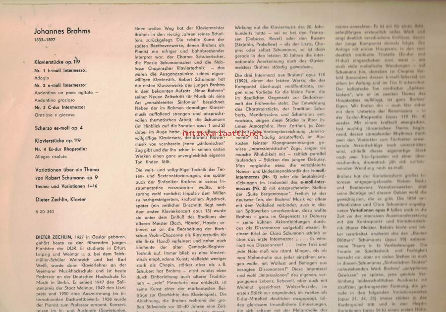 Johannes Brahms - Dieter Zechlin, KlavierEterna, DDR, Erittäin siisti ja hyväkuntoinen levy-Postipaketti