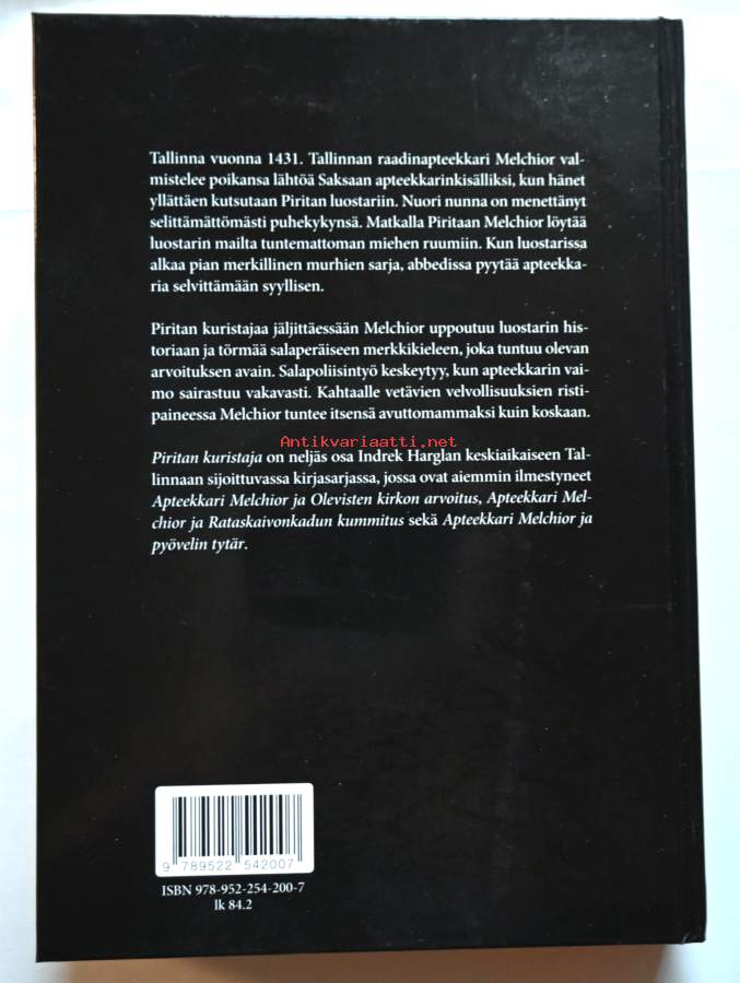 Tallinna vuonna 1431. Tallinnan raadinapteekin pitäjä apteekkari Melchior valmistelee poikansa lähtöä Saksaan apteekkarinopintoihin, kun hänet yllättäen kutsutaan Piritan luostariin viisaiden miesten konsiiliin. Luostarin mailta on lumien sulettua löydetty tuntemattoman miehen ruumis. Kun seuraava uhri, yksi luostarin nunnista, löydetään kuoliaaksi kuristettuna, alkaa Piritan kuristajaksi nimetyn murhaajan jäljittäminen. Luostarin abbedissan Kandisin pyynnöstä apteekkari Melchior lupaa selvittää syyllisen. Luostarin asukkaista useammallakin tuntuu olevan salattavaa ja mahdollinen motiivi surmatöihin. Melchior uppoutuu tutkimuksissaan luostarin historiaan, jonka pyörteet vievät hänet aina Piritan alkuvaiheisiin ja sukupolvelta toiselle siirtyneisiin salaisuuksiin. Piritan kuristaja on neljäs osa Indrek Harglan keskiaikaiseen Tallinnaan sijoittuvassa Apteekkari Melchior -sarjassa