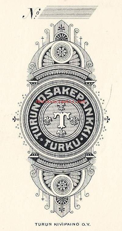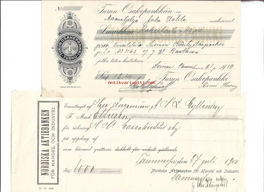Turun Osakepankki 1919 ja Nordiska Aktiebank 1900 kuitti 2 kpl erä