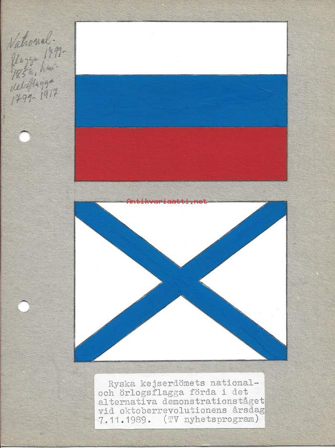Ryska kejserdömets national och örlogsflaggalippu alkuperäinen guassimaalaus pahville 22x16 cm ja seloste