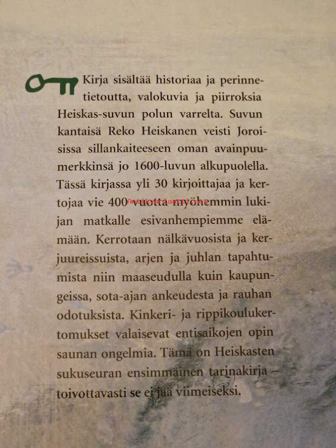 Ulkoasu 182 sivua : kuvitettu ; 26 cm Kirjoittajat: Asko Heiskanen ja muita.Julkaisija [Kuopio] : Heiskasten sukuseura, 2005Luokitus Sukututkimus. Genealogia (udkf 929.5/.9)Aiheet Heiskanen → (suku) muistelmat suvut toimittanut Kaija Heiskanen ; [piirrokset: Tuomo Heiskanen]ISBN 952-91-8331-3 sidottu