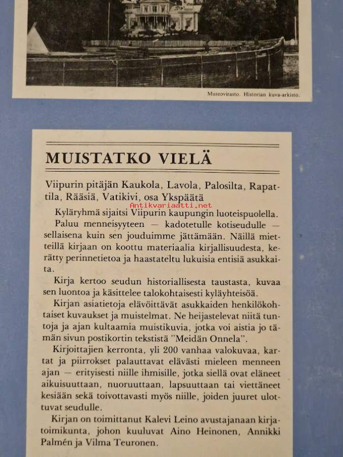 Ulkoasu 251 sivua : kuvitettu, karttoja ; 26 cmKieli suomiJulkaisija [Hollola] : [Kylätoimikunta], 1991Luokitus udkf 908 Viipurin maalaiskuntaHenkilöhistoria. Elämäkerrat. Muistelmat. Matrikkelit (udkf 929)Karjala (ykl 92.87)Aiheet paikallishistoriat (historiikit) kylät maatilat kotiseutukuvaukset muistelmat luovutetut alueet historia Viipurin maalaiskunta Karjala Kalevi LeinoISBN 952-90-2926-8 kovakantinen