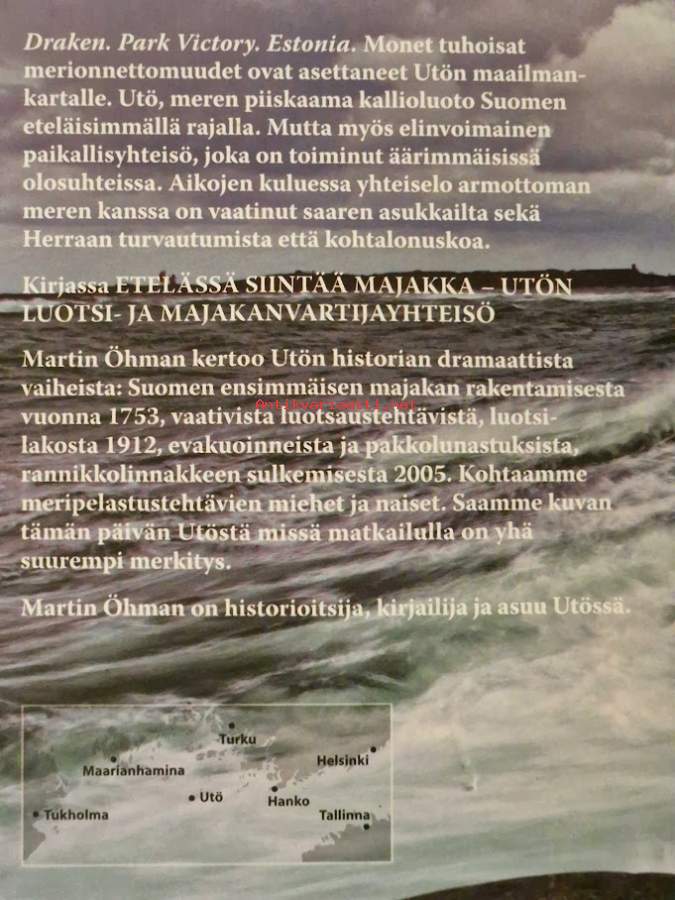 Genre paikallishistoriatUlkoasu 260 sivua : kuvitettu, karttoja ; 23 cmJulkaisija Martin Öhman, [2022]Luokitus udkf 908 Parainenudkf 908 KorppooVarsinais-Suomi (ykl 92.81)Aiheet saaret luotsiasemat majakat linnakkeet paikallisyhteisöt historia Utö (Parainen) Korppoo Martin Öhman ; kuvat: Frans Bergman [ja muita] ; käännös suomeksi: Martin Öhman, Pekka LaaksonenISBN 978-952-69986-0-2 kovakantinen
