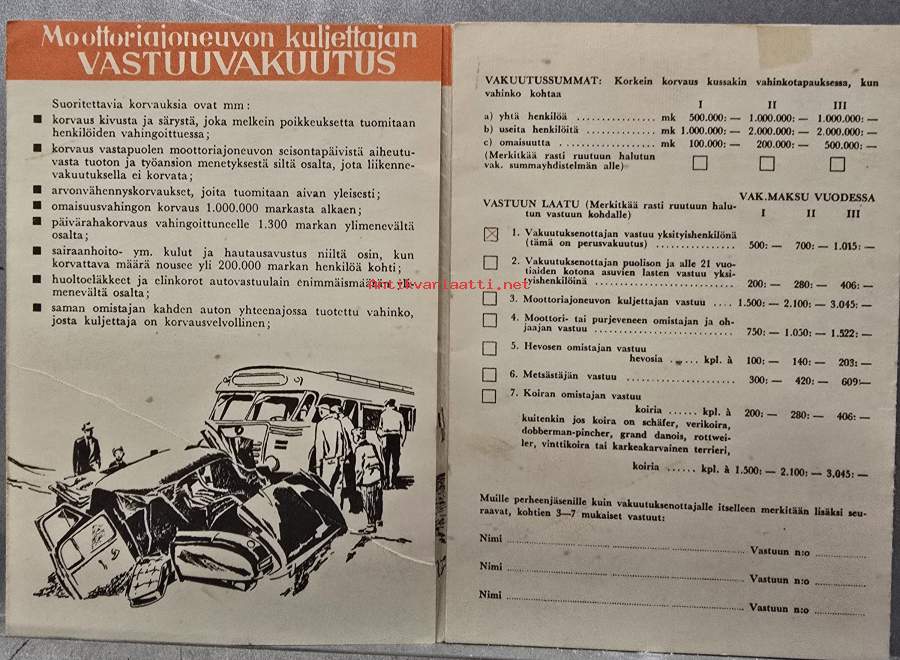 Moottoriajoneuvon kuljettajan vastuuvakuutus hakemus. Aukeaa 4 osaan. Koko 10 x 15 cm
