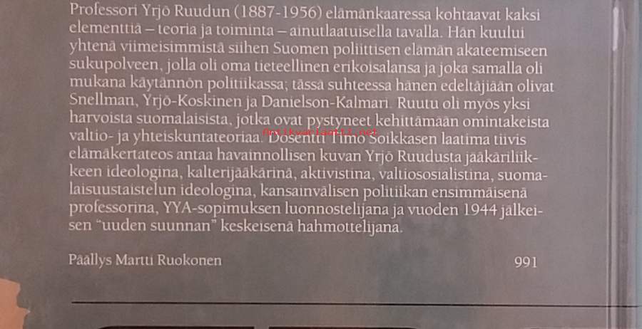 Omaelämäkerta valottaa Ruudun ajattelua ja 1900-luvun poliittisia liikkeitä sekä hänen rooliaan mm. jääkäriliikkeen ideologina, kalterijääkärinä ja aktivistina, valtiososialismin kehittäjänä jne. Kuvitettu. Dimensiot 21 ¤ 15 cm.