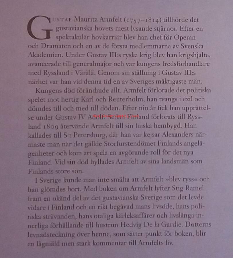 Historiikki kuvaa Armfeltin elämän kaaren hovin suosikista poliittiseksi pakolaiseksi ja lopulta Suomen suuriruhtinaskunnan keskeiseksi vaikuttajaksi. Kuvitettu. Dimensiot 23 ¤ 16 cm.