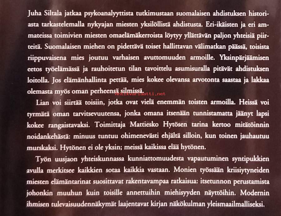Siltala kuvaa, miten miehen identiteetti rakentuu pärjäämisen, kontrollin ja etäisyyden varaan – ja mitä tapahtuu, kun nämä murtuvat. Kuvitettu. Dimensiot 24 ¤ 17 cm