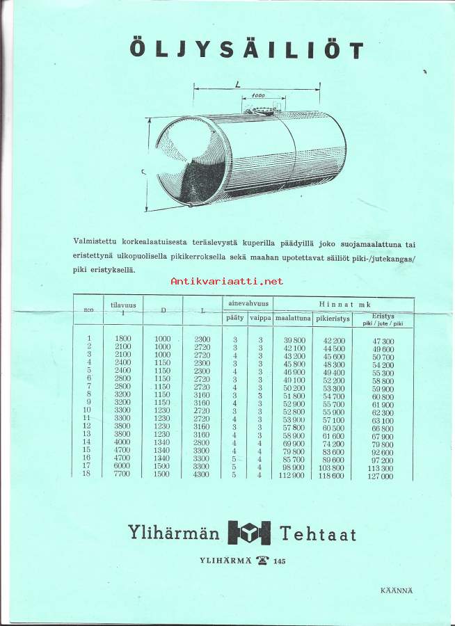 Ylihärmän Tehtaat Ylihärmä - Öljysäiliöt hinnasto tuote-esite