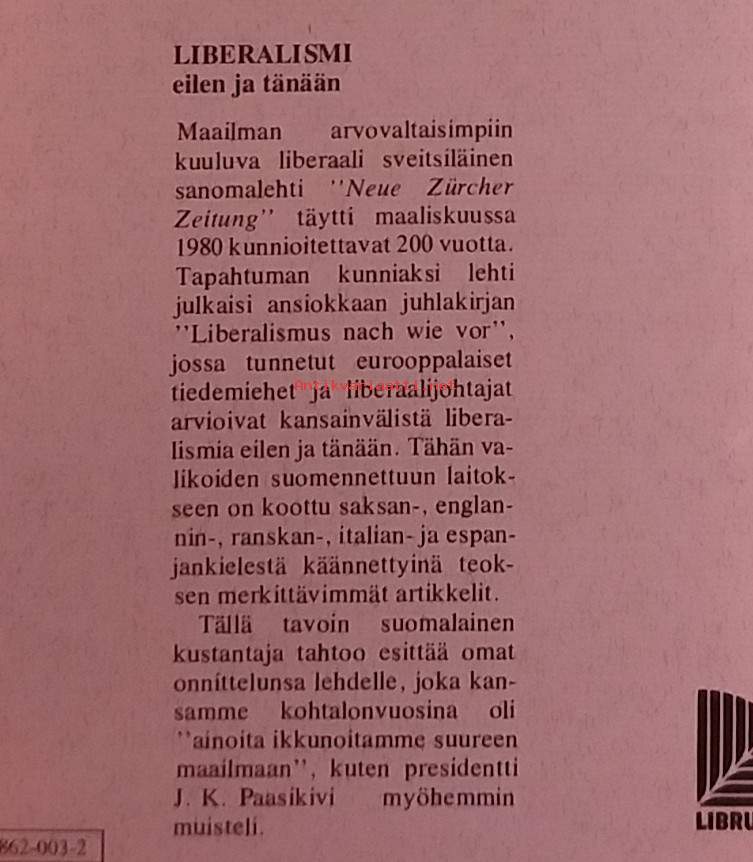 Kirja tarkastelee liberalismia sekä historiallisena että modernina yhteiskunnallisena aatteena. Se avaa liberalismin kehitystä, sen sisäisiä jännitteitä ja suhdetta talouteen, valtioon ja yksilönvapauteen. Luodon toimitustyö korostaa analyyttistä, selkeää ja aatehistoriallisesti jäsenneltyä otetta. Dimensiot 22 ¤ 16 cm