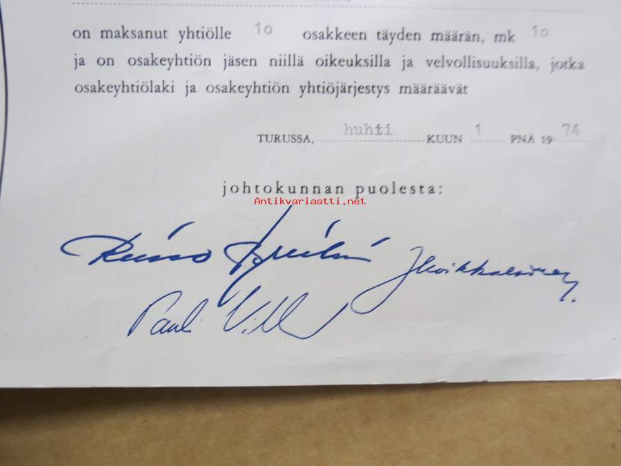 Lounais-Suomen Kirjapaino Osakeyhtiö, Turku 1.4.1974, 10 osaketta 10 mk -osakekirja nr 165493-165502 (Aarne Sitro)