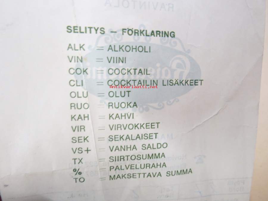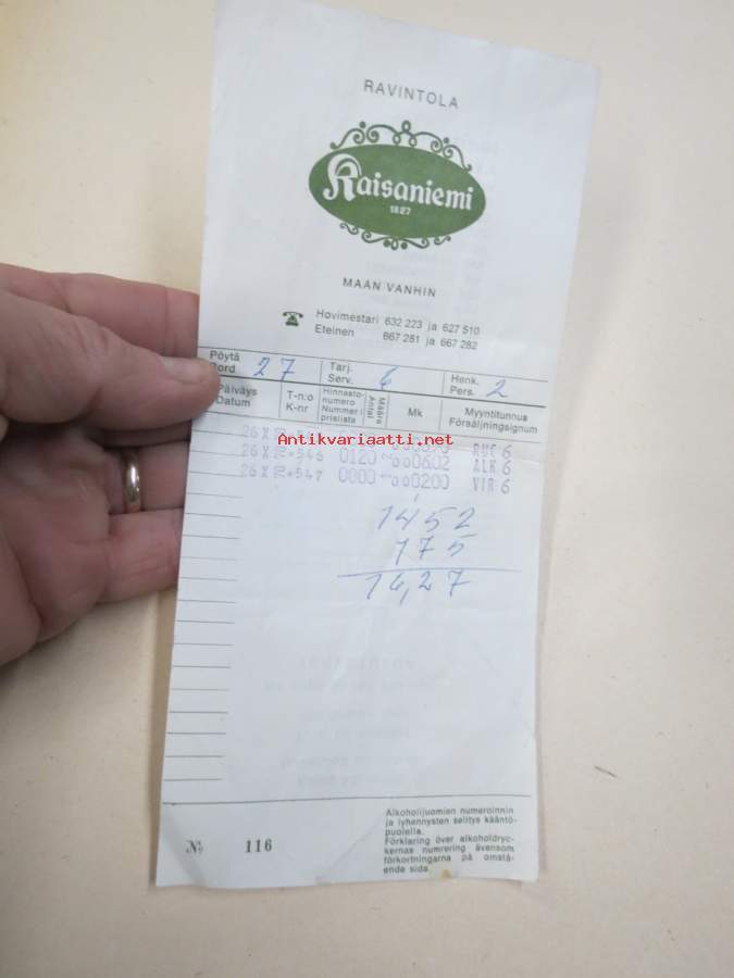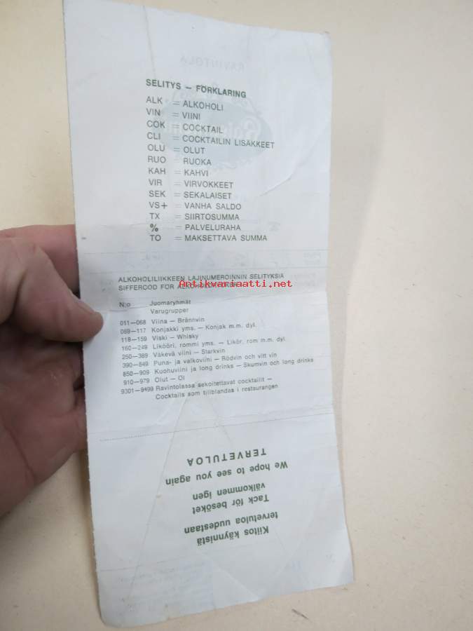 Ravintola Kaisaniemi, 26.10.1970 -kuitti
