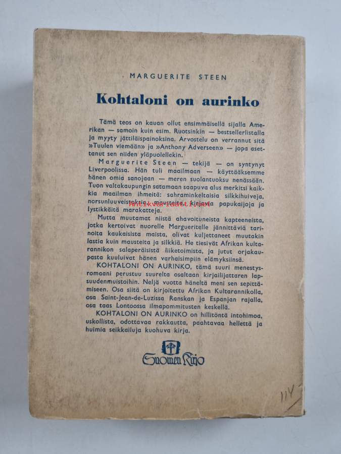 Marguerite Steen / Kohtaloni on aurinko. Kaksi osaa. Viides painos v.1958. Ilmestynyt ensimmäisen kerran 1943,