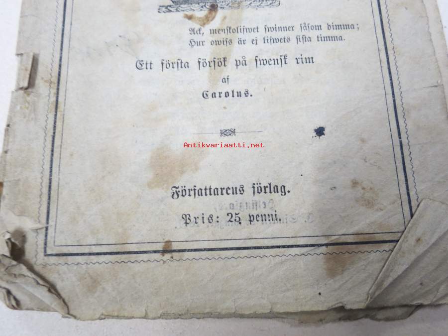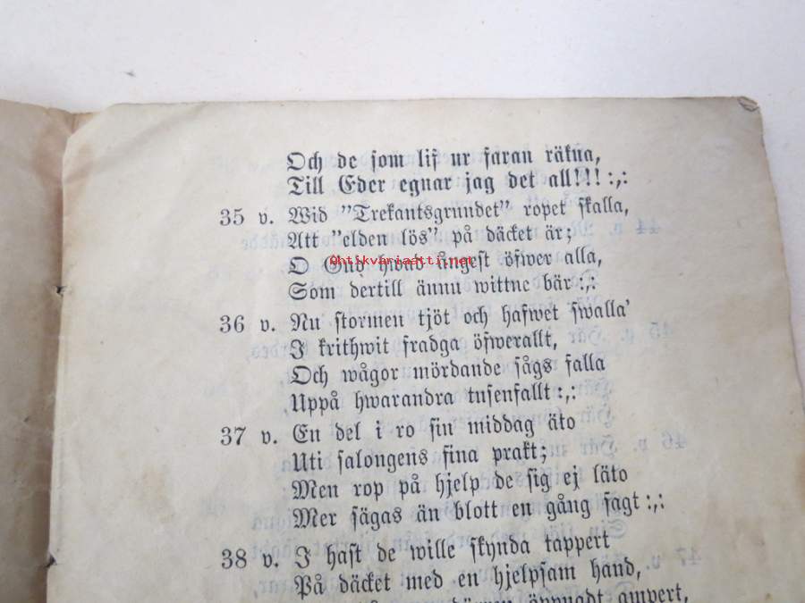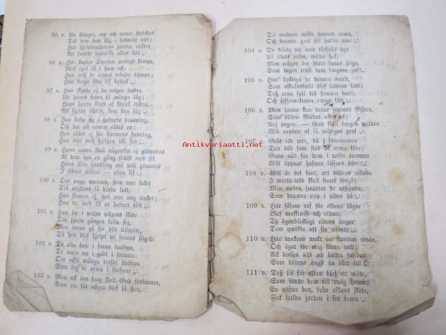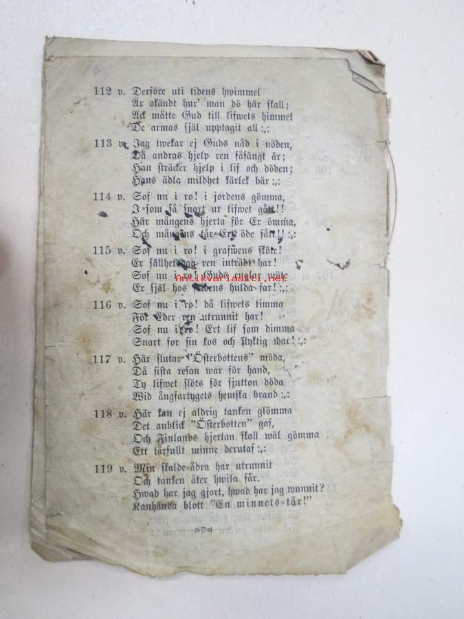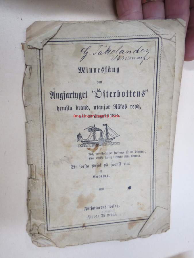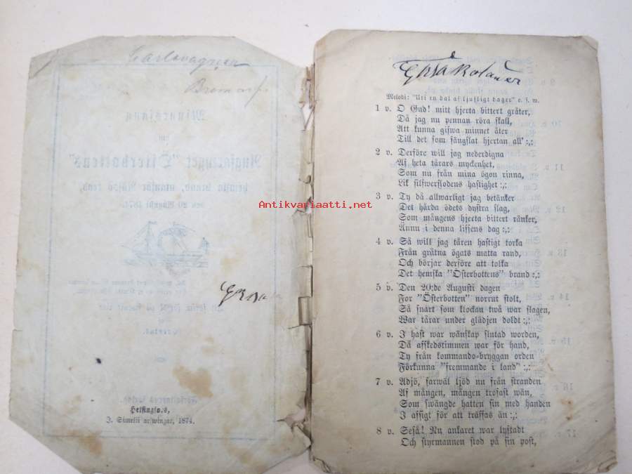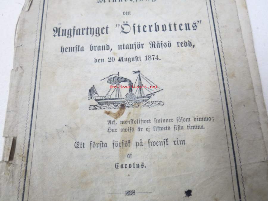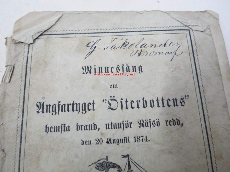 Minnessång om Ångfartyget "Österbottens" hemska brand, utanför Räfsö redd den 20 Augusti 1874 -arkkiveisu, höyrylaiva Österbottenin tuhoisa palo Reposaaren redillä