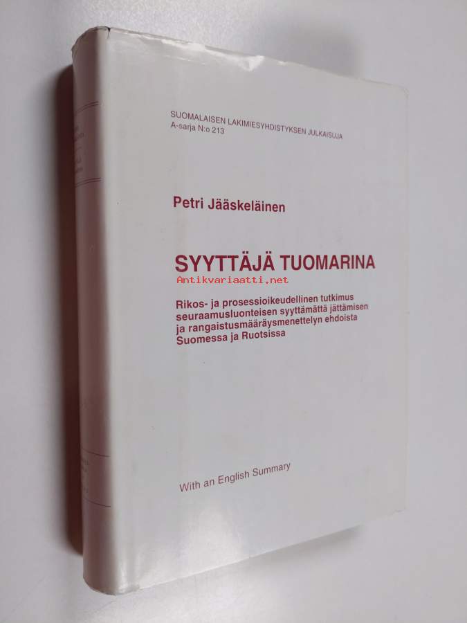 Koko nimi: Syyttäjä tuomarina : rikos- ja prosessioikeudellinen tutkimus seuraamusluonteisen syyttämättä jättämisen ja rangaistusmääräysmenettelyn ehdoista Suomessa ja RuotsissaSarja: Suomalaisen lakimiesyhdistyksen julkaisuja. A-sarja n:o 213Asiasanat: päätöksenteko, syyttäjät, rikosoikeus, rikosprosessi, prosessioikeus, seuraamukset, toimenpiteistä luopuminen, rangaistusmääräysmenettely