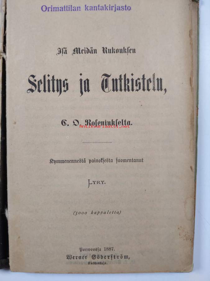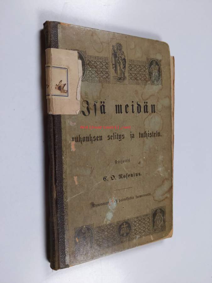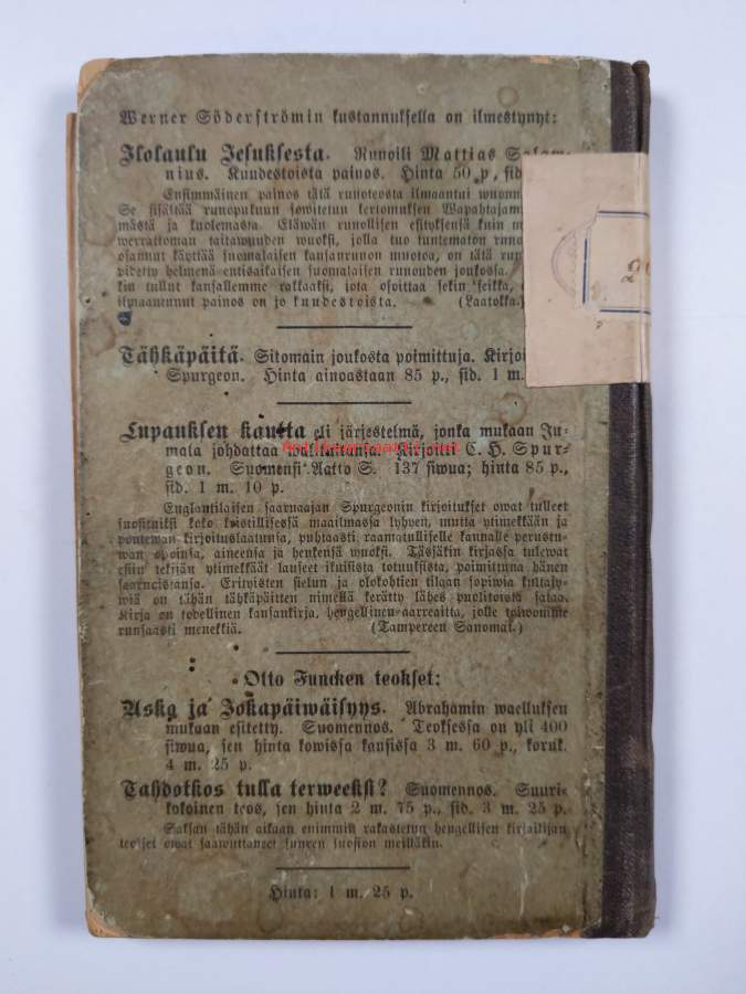 Tyydyttävä. Tarkempi kuntoluokka: K2- ; Jonkin verran läikkää kansissa, selkämyksessä aavistus vinoutta. teksti fraktuuraa ; sidos osittain irti
