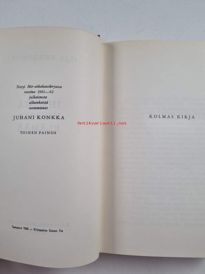 Tyydyttävä. Tarkempi kuntoluokka: K2+ ; Hieman tahraisuutta kansissa, selkämyksessä hieman vinoutta. Kansipaperin kunto: joitain repeämiä/kulumaa