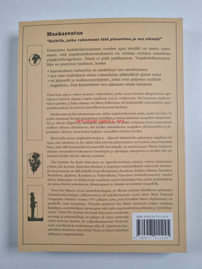 Alkuteos: Earth educationAsiasanat: luonto, elämäntapa, ympäristönsuojelu, maapallo, kasvatus, ympäristö, elämä, eliöyhteisöt, kasvatustiede, ympäristökasvatus, seikkailukasvatus