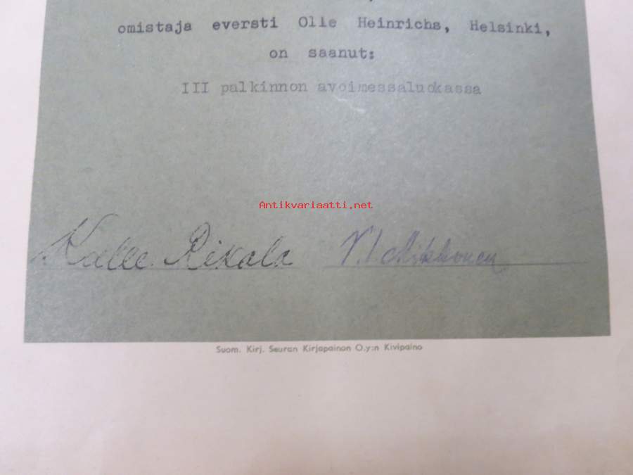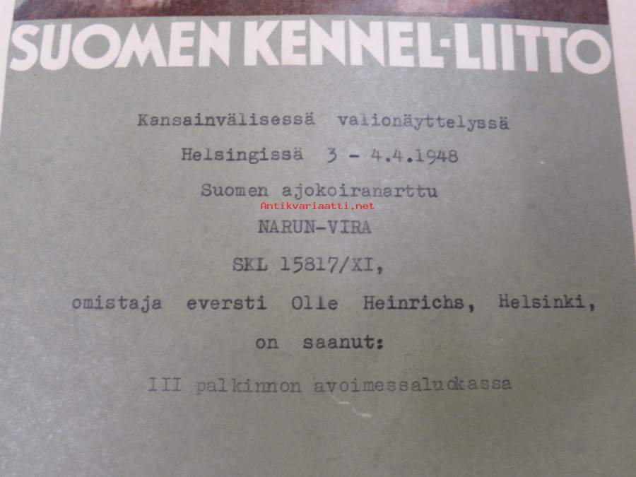 Suomen Kennel-Liitto - Kansainvälinen valionäyttely Helsinki 1948- Suomen ajokoiranarttu Narun-Vira SKL 15817/XI, om. eversti Olle Heinrichs, III Palk. -kunniakirja
