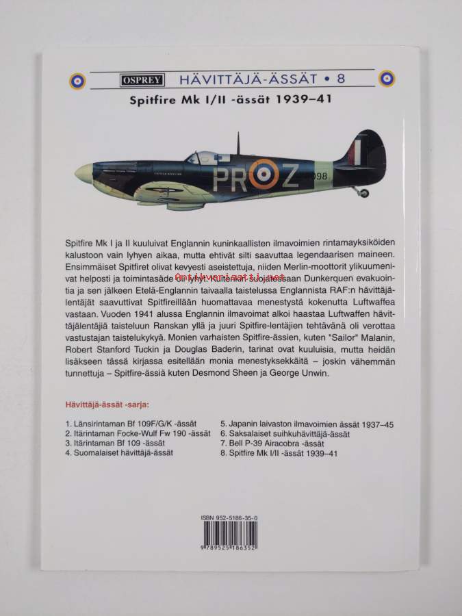 Muu(t) tekijä(t): Heikki Lehti, John Weal ym.Sarja: Osprey hävittäjä-ässät 8; Hävittäjä-ässät 8Alkuteos: Spitfire Mark I/II -Aces 1939-41Asiasanat: historia, sotahistoria, toinen maailmansota, Ilmavoimat, lentäjät, sotilaslentäjät, ilmasota, sotilaslentokoneet, sotilasilmailu, hävittäjät (sotilaslentokoneet), andra världskriget, krigshistoria, militärflyg, militärflygare, militärflygplan, luftkrig, flygvapnet, flygare, jaktplan