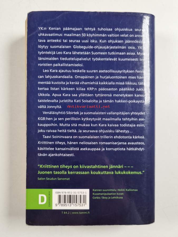 Hyvä. Tarkempi kuntoluokka: K3- ; Pienoista naarmuisuutta kansissa, hieman kulumaa kansissa, aivan pienoista repeämää kulmissa, selkämyksessä aavistus vinoutta, selkämyksessä lukutaittumaa