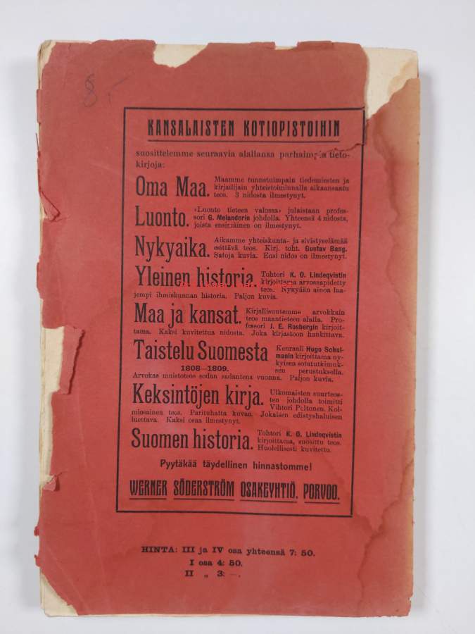 kansien reunoilta puuttuu pieniä palasia ; etukannessa ja muutamalla sivulla jonkin verran läikkää ; muutamalla sivulla jonkin verran foxingia (ominaisuus ei puute)