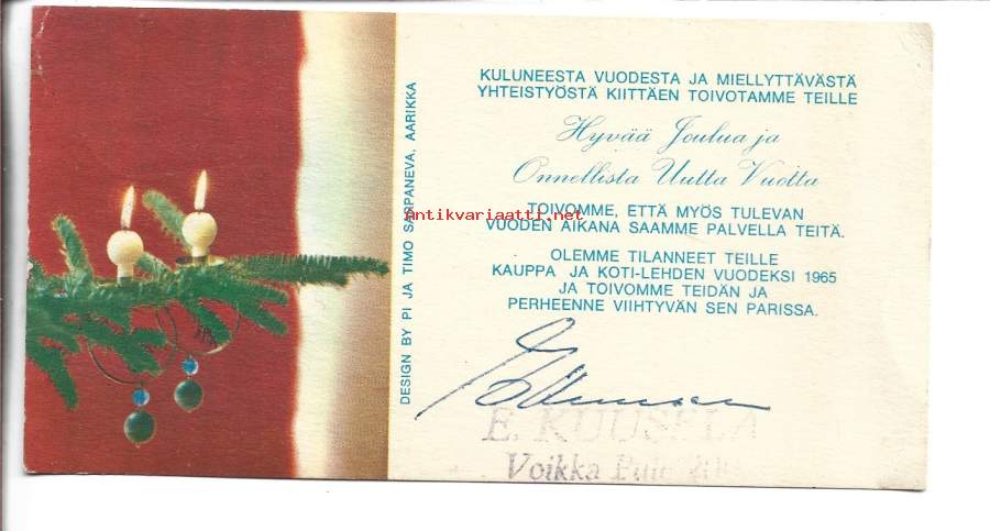 E Kuusela Voikka / Kauppa ja Koti lehti vuodeksi 1965 - joulukortti uudenvuodenkortti mainoskortti