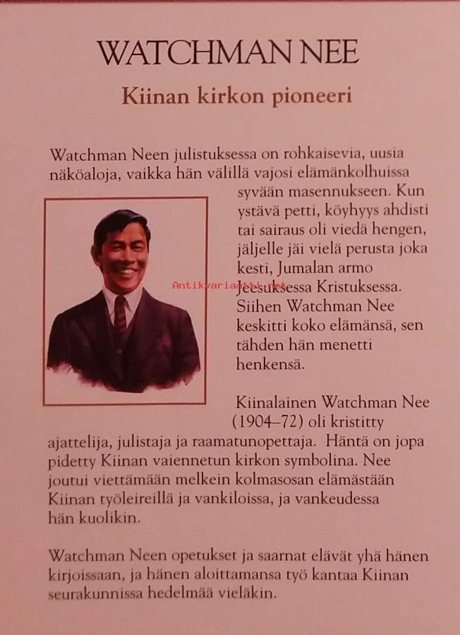 Teos keskittyy Neen hengelliseen vaikutukseen mm: kotiseurakuntaliikkeen pioneerina, hengellisenä johtajana, kärsivänä kristittynä, joka vietti vuosia vankilassa jne. Nee syntyi vuonna 1903 kristittyyn perheeseen Fuzhoussa. Hän oli itseoppinut ajattelija, joka yhdisti idän ja lännen hengellisiä perinteitäDimensiot 21 ¤ 14 cm.
