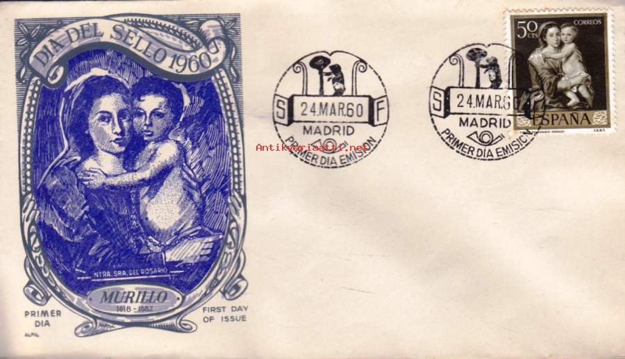 FDC - Espanja - Postimerkin päivä 1960 (24.3.). Taidemaalari Murillo (1618-1682). Nostra Senora Del Rosario. ALFIL