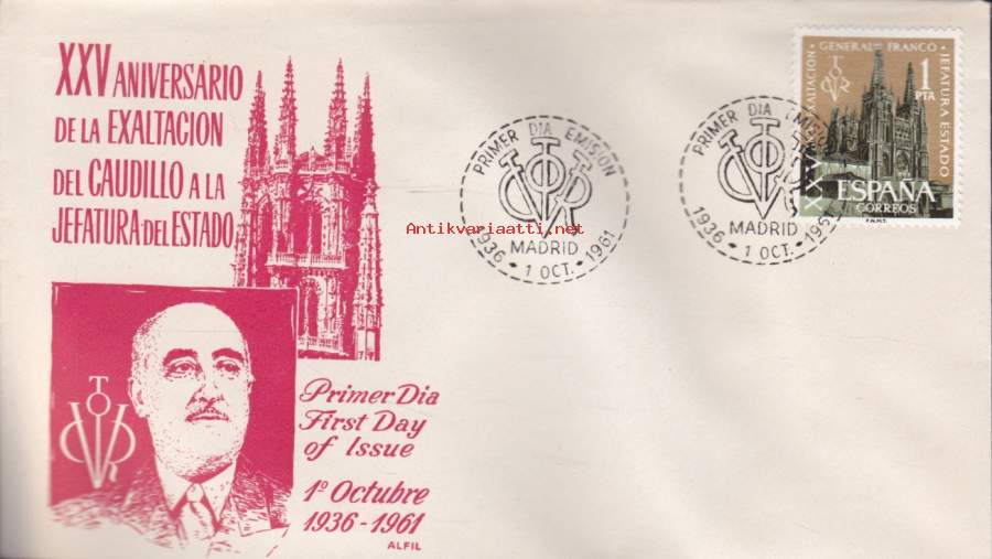 FDC - Espanja - XXV Aniversario de la Exaltacion del Caudillo a la Jefatura del Estado 1961 (1.10.). ALFIL