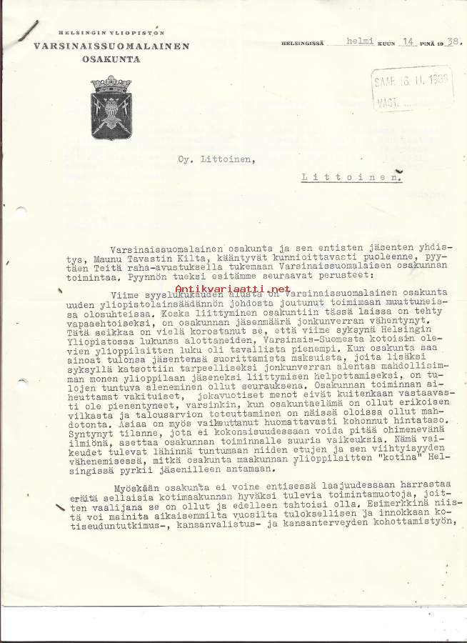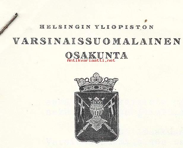 Varsinaissuomalainen Osakunta 1938 - firmalomake