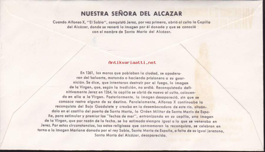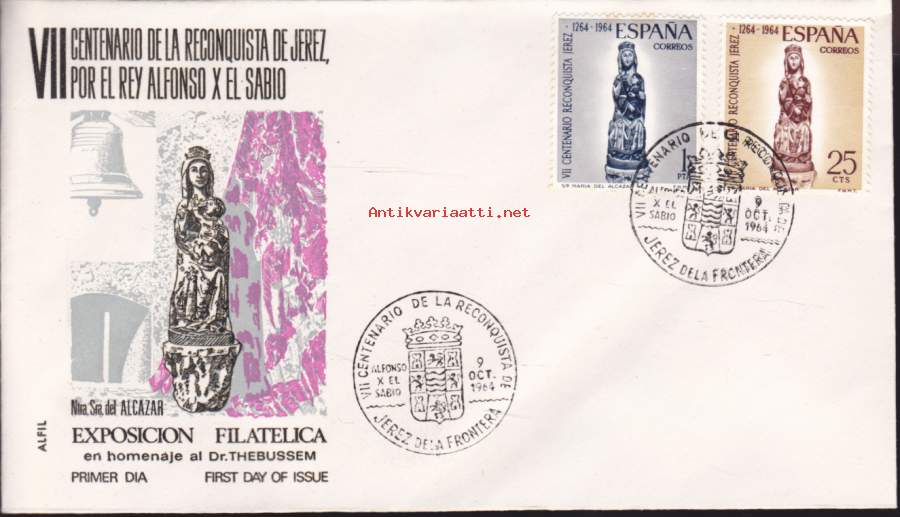 **Aihe: Jerezin kaupungin uudelleenvaltaus (Reconquista) kristityille vuonna 1264 . Juhlavuosi: 700 vuotta → VII Centenario Ensipäivä: 9.10.1964. Jerez de la Frontera oli osa Al‑Andalusia, kunnes Kastilian kuningas Alfonso X El Sabio (Viisas Alfonso) valloitti kaupungin takaisin kristityille. Postimerkkisarja ei kuvaa pelkästään kaupungin valloitusta, vaan myös kaupungin tärkeintä suojeluspyhimystä: Nuestra Señora del Alcázar.**