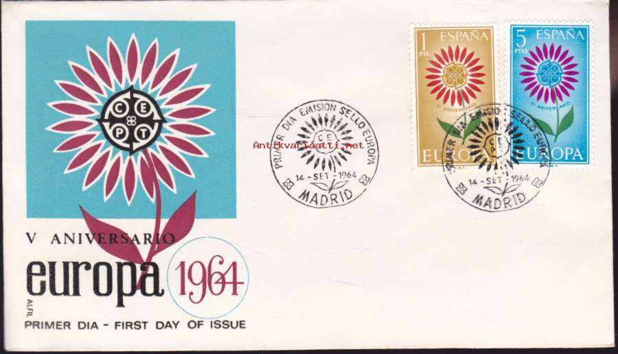 **🌿 “Europa‑puu” / “Tree of Europe”*runko = Euroopan yhtenäisyys*oksat = jäsenmaat*modernistinen graafinen tyyli*värit vaihtelevat nimellisarvon mukaan (Espanjalla yleensä vihreä, sininen tai ruskea sävy)**-Alfil teki tästä sarjasta tyylikkään kuoren, jossa on yleensä:*tyylitelty Eurooppa‑puu*CEPT‑symboli*moderni 1960‑luvun typografia*Espanjan värit tai neutraali eurooppalainen värimaailma*Alfilin versiot ovat huomattavasti näyttävämpiä kuin Correosin peruskuoret.**Leima on:👉 Espanjan postin virallinen CEPT‑erikoisleima 👉 “Primer día de emisión” (ei S.F.-leima)👉 Madrid 14 SET 1964 👉 Käytössä vain V Aniversario de Europa / CEPT 1964 ‑julkaisussa