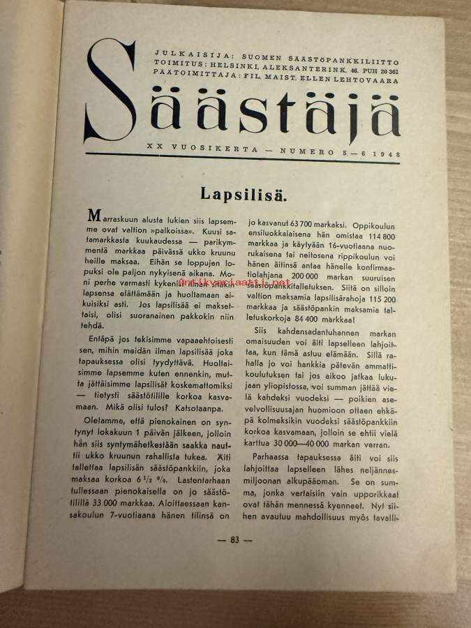 Säästäjä 1948 nr 5-6 -säästöpankkien asiakaslehti, artikkeleita, sarjakuvia yms.