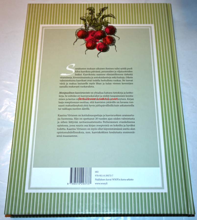 Suositusten mukaan aikuisen ihmisen tulisi syödä puoli kiloa kasviksia päivässä, perunoiden ja viljatuotteiden lisäksi. Kasviksista saamme elimistöllemme tärkeitä vitamiineja, kivennäisaineita ja antioksidantteja sekä kuituja. Oikein valmistettuina kasvikset ovat todella herkullista ruokaa. Ne tuovat väriä ja makua lautaselle myös lihan ja kalan viereen keventäen samalla mukavasti ruokavaliota. Monipuolinen kasvisravinto on yhtaikaa kattava tietokirja ja keittokirja. Se esittelee eri kasvisruokavaliot ja niiden tasapainoisen koostamisen ja kertoo myös kasvisravinnon vaikutuksista terveyteen. Kirjan laaja reseptiosuus osoittaa, että kasvisten ystävälle on luvassa runsaasti makuelämyksiä yhtä hyvin juhlapäivällisillä kuin arkiaterioilla tai vaikkapa nuotion äärellä. Kaarina Virtanen on kotitalousopettaja ja kasvisruokien uranuurtajia Suomessa. Hän on opettanut 20 vuoden ajan niiden valmistusta ja siihen liittyvää ravitsemustietoutta Perheniemen evankelisessa opistossa, jossa suurin osa kirjan resepteistä on kokeiltu ja hyväksi todettu. Kaarina Virtanen on myös ollut käynnistämässä useita alan opintomahdollisuuksia, mm. kasviskokkien koulutusta ensimmäisenä maassamme.
