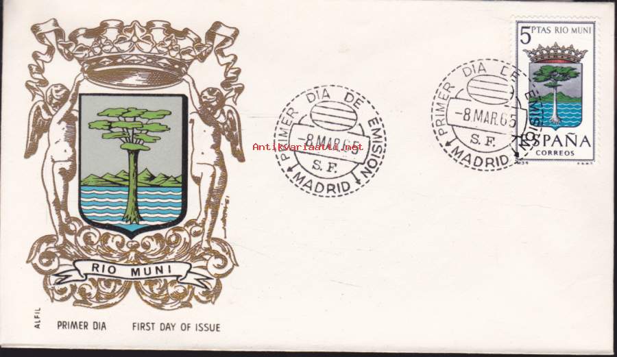 **ALFILin taiteellinen ensipäivänkuori, julkaistu Espanjan siirtomaa‑alueen Río Munin (nyk. osa Päiväntasaajan Guineaa) postimerkkisarjan yhteydessä vuonna 1965. Kuoren grafiikka heijastaa 1960‑luvun siirtomaa‑aiheiden tyylikästä ja selkeää esitystapaa, ja aihe on suosittu Afrikka‑ ja siirtomaa‑teemaisissa kokoelmissa.**Leima: Primer día de emisión, 8 MAR 1965 Valmistaja: ALFILTyyppi: Siirtomaa‑aiheinen erikois‑FDC; laadukas ALFIL‑painatus ja keräilijöille kiinnostava aihepiiri.**Kuoren takana on historiallista tietoa Río Munista, Espanjan entisestä siirtomaa‑alueesta Länsi‑Afrikassa. Alue tunnettiin trooppisista metsistään, kaakaon ja kahvin viljelystä sekä monimuotoisesta kulttuuristaan. Río Muni muodostaa nykyään mantereen puoleisen osan Päiväntasaajan Guineaa.**