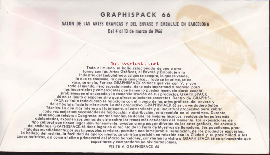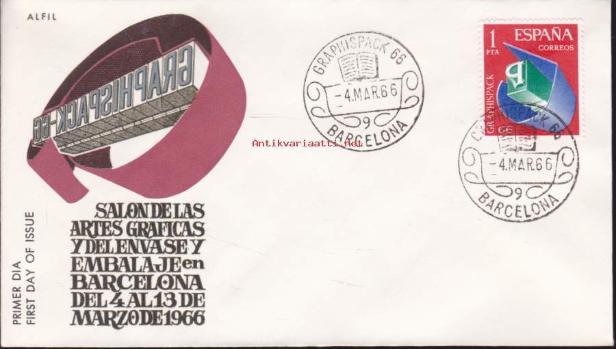 **ALFILin taiteellinen ensipäivänkuori, julkaistu Barcelonassa järjestetyn Graphispack 66 ‑näyttelyn kunniaksi. Graphispack oli 1960‑luvun merkittävimpiä graafisen teollisuuden, painotekniikan ja pakkausalan messuja, ja tapahtuma korosti Espanjan modernisoituvaa graafista ja painoalaa. Kuoren grafiikka edustaa aikakauden modernistista visuaalista ilmettä, joka sopii erinomaisesti design‑ ja teollisuushistoria‑teemaisiin kokoelmiin.Leima: Graphispack 66, 4 MAR 66, Barcelona Valmistaja: ALFIL Tyyppi: Teollisuus‑ ja designaiheinen erikois‑FDC; moderni 1960‑luvun grafiikka ja vahva temaattinen kiinnostavuus.**