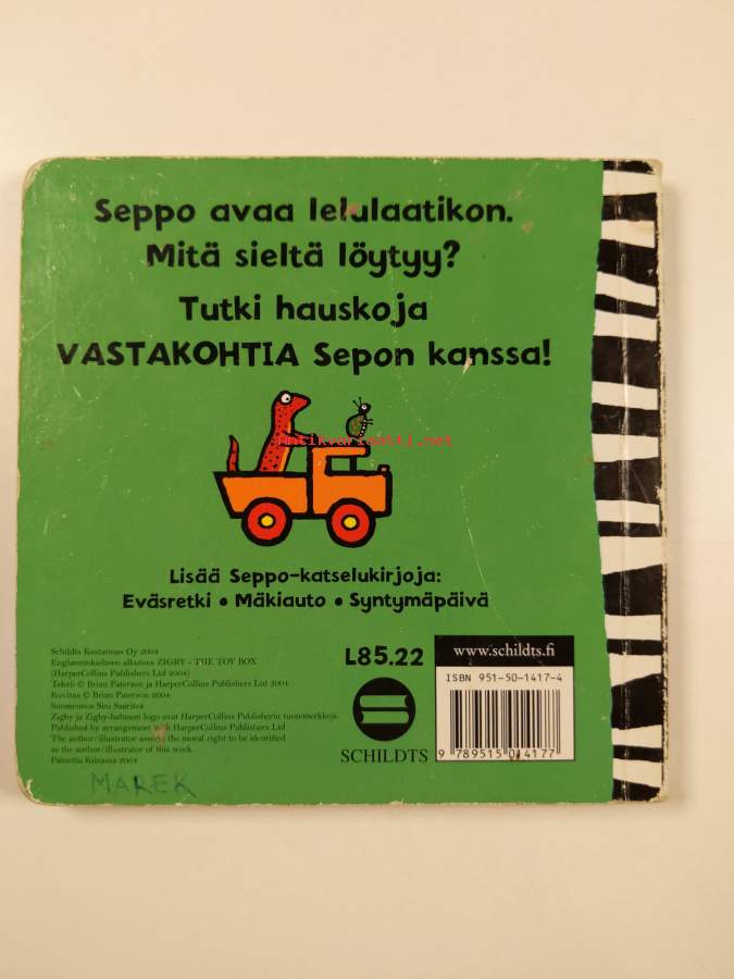 Muu(t) tekijä(t): Sini SaaritsaAlkuteos: Zigby : the toy boxAsiasanat: lastenkirjallisuus, leikkikalut, seeprat, vastakohdat, paksulehtiset kirjat, katselukirjat