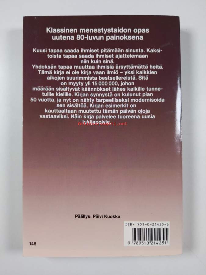 Muu(t) tekijä(t): Risto Mäenpää, Dorothy Carnegie ym.Alkuteos: How to win friends and influence peopleAsiasanat: ihmissuhteet, positiivisuus, vaikuttaminen, sosiaaliset taidot