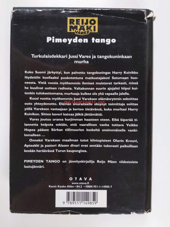 Hyvä. Pienoista tahraisuutta kansissa, pienoista kulumaa kansissa, aivan pienoista repeämää selkämyksen yläpäässä, selkämyksessä hieman vinoutta. Kansipaperin kunto: joitain repeämiä/kulumaa
