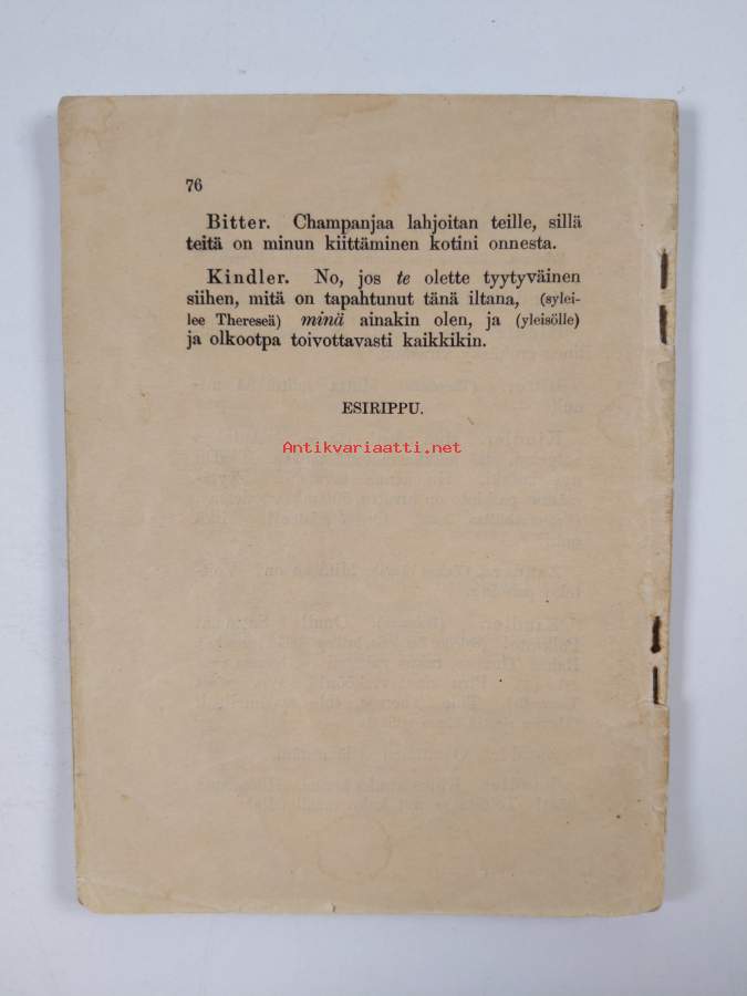 Huonokuntoinen (lukukelpoinen). Jonkin verran nuhruisuutta kansissa, selkämyksessä aavistus vinoutta, muutamalla sivulla lyijykynämerkintöjä. takakansi puuttuu